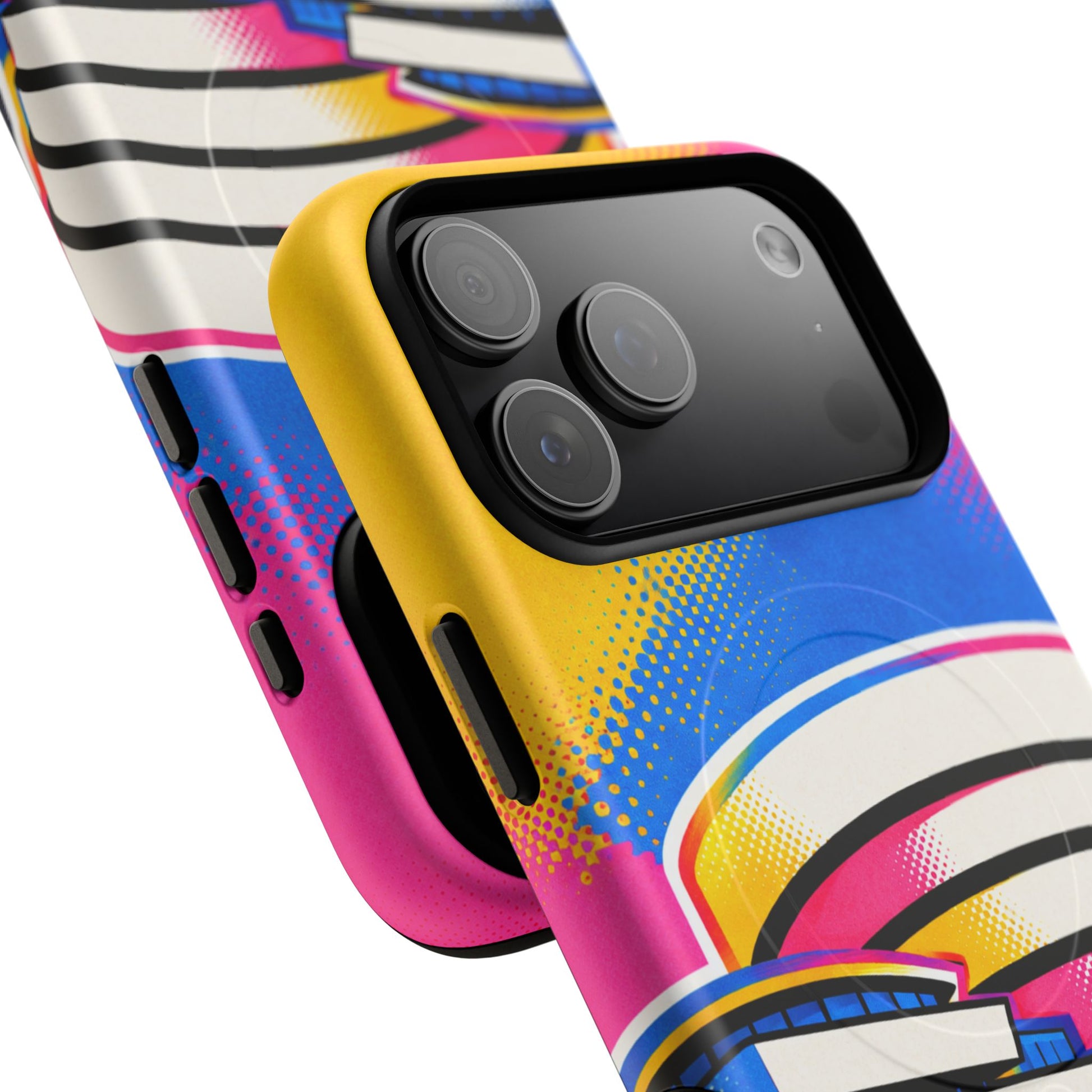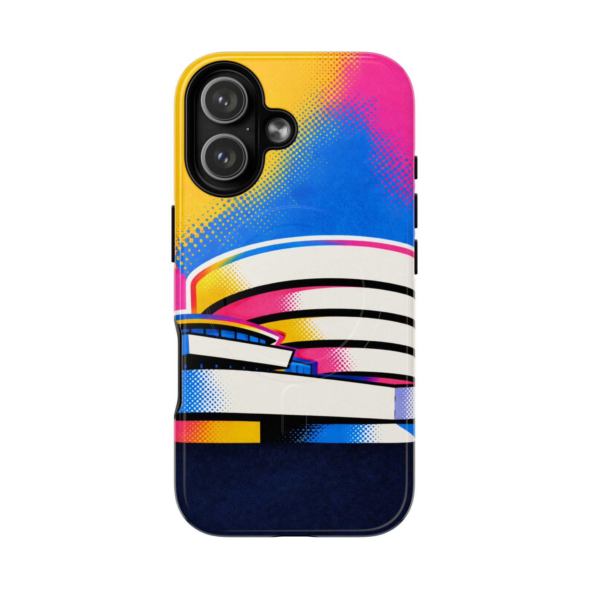 Protective MagSafe® compatible phone case showcasing a striking graphic reinterpretation of the Guggenheim Museum, turning an architectural icon into a modern statement piece.